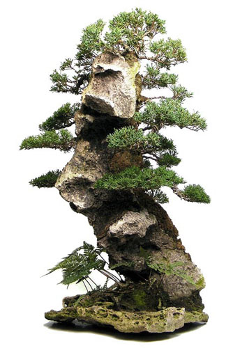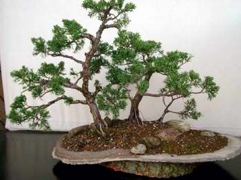Juniperus Chinensis (Itoigawa), ca. 10 Jahre alter Shohinbonsai, DM 6 cm, Höhe: 12 cm, Floßform um einen Stein sehr filigran