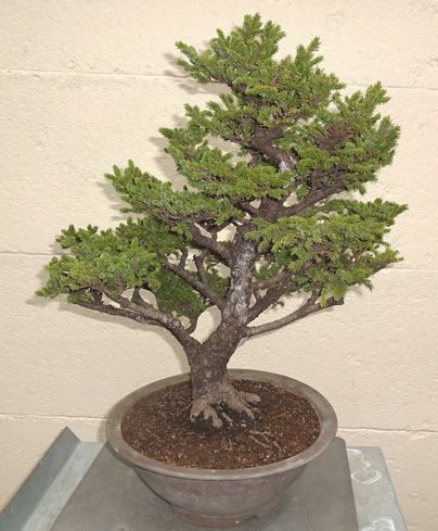 Blaue Zypresse (Hinoki-Scheinzypresse), ca. 20 Jahre alt, DM ca. 12 cm, gestaltet als Gartenbonsai (Formbaum), Höhe: 90 cm, flache runde Pflanzschale